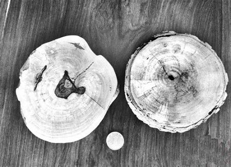 李先生给记者看了一张照片(如图),照片中有两块黄花梨木材,胸径都在20厘米左右。其中一块心材不到筷子粗,另一块虽然心材较大,但内部出现了杂质。“可见形成心材很不容易。”他说。