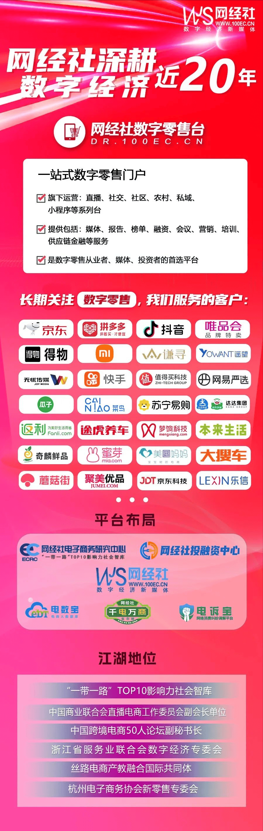 网经社深耕数字经济行业近20年,持久关心数字零售,旗下数字零售台办事的客户有:京东、抖音、快手、唯品会、遥望、谦寻、达达集团、小米、得物、网易严选、苏宁易购、什么值得买、返利网、途虎养车、梦饷科技、本来糊口、奇麟鲜品、京东科技、蜜芽、美囤妈妈、乐信、大搜车、瓜子二手车、蘑菇街、聚美优品、无忧传媒、菜鸟等。
